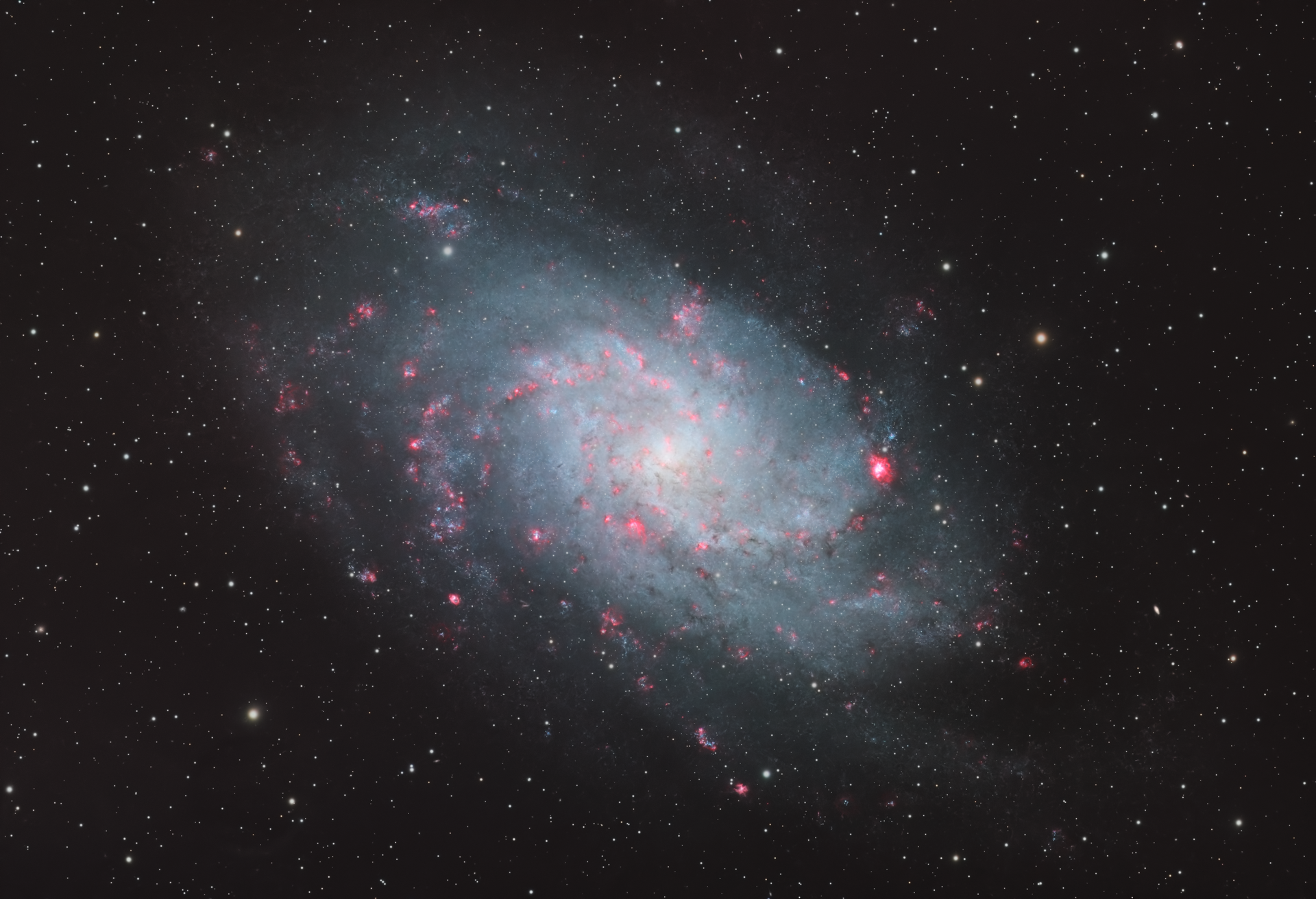 La Galassia del Triangolo è un obiettivo amatissimo dagli astrofotografi. Nonostante la sua luminosità diffusa la renda complicata da riprendere, le lunghe esposizioni rivelano incredibili dettagli: le regioni HII in rosa, i bracci blu popolati da giovani stelle e il nucleo tenue che contrasta con la brillantezza di Andromeda.