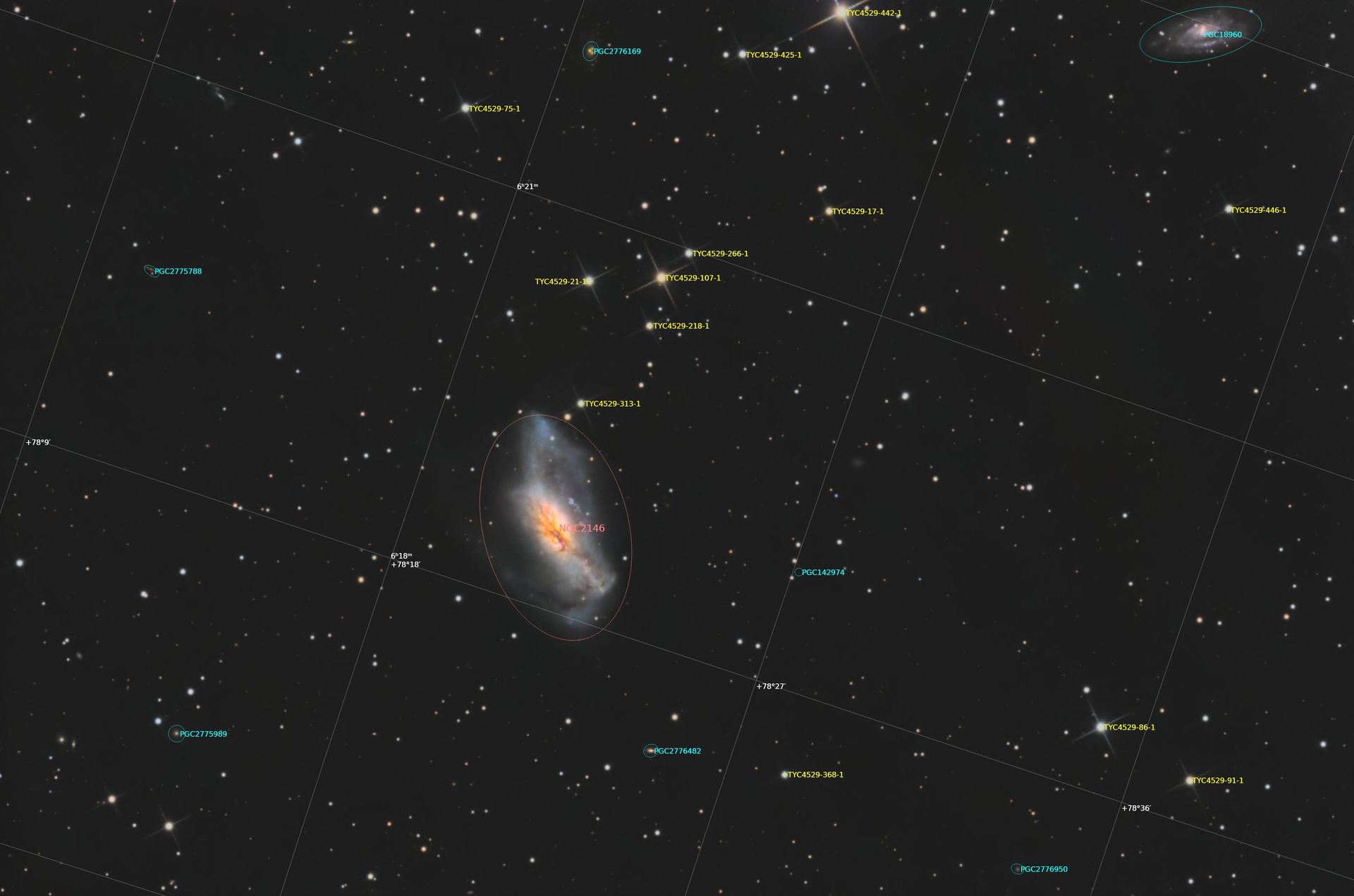 NGC 2146 non è solo bella da guardare: negli anni sono state osservate diverse supernovae al suo interno, testimoni della vita breve ma intensa delle stelle massicce che vi nascono continuamente. Questi eventi contribuiscono a modellare la galassia, espellendo gas e creando bolle che la rendono ancora più vivace e complessa.