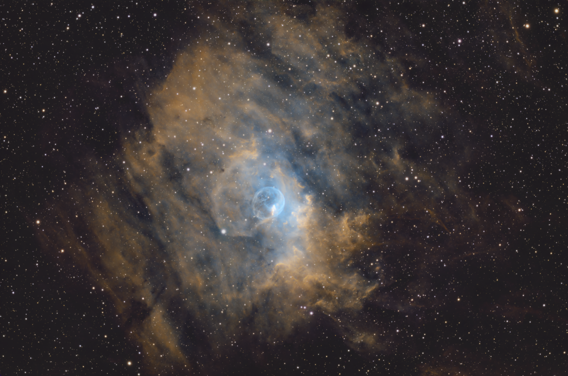 Questa struttura delicata e complessa si trova immersa in un vasto campo di nebulosità a emissione e riflessione, che aggiunge profondità e colore all’intera regione. La Nebulosa Bolla è un piccolo capolavoro dell’interazione tra stelle e mezzo interstellare, un equilibrio tra potenza e grazia che affascina astronomi e astrofotografi di tutto il mondo.